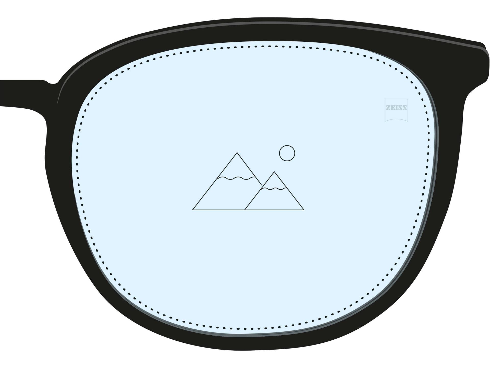 A point of view image through a ZEISS Progressive SmartLife lens: The blurred zones left and right of the lens are small and enable large clear vision zones.